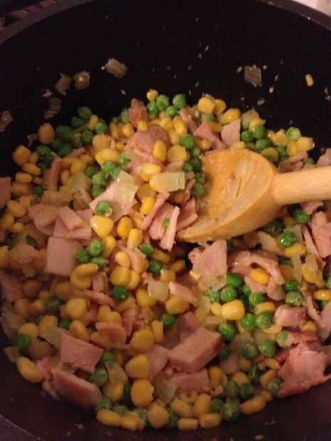 Trocear el bacon y añadir a la olla, con los guisantes y el maíz.