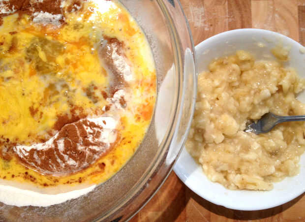 En una placa, Machaque los plátanos y agregar a la taza. Mezclar hasta que se combinan todos los ingredientes.