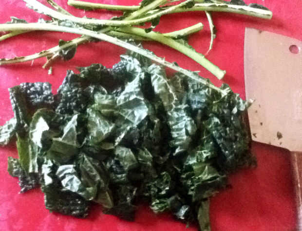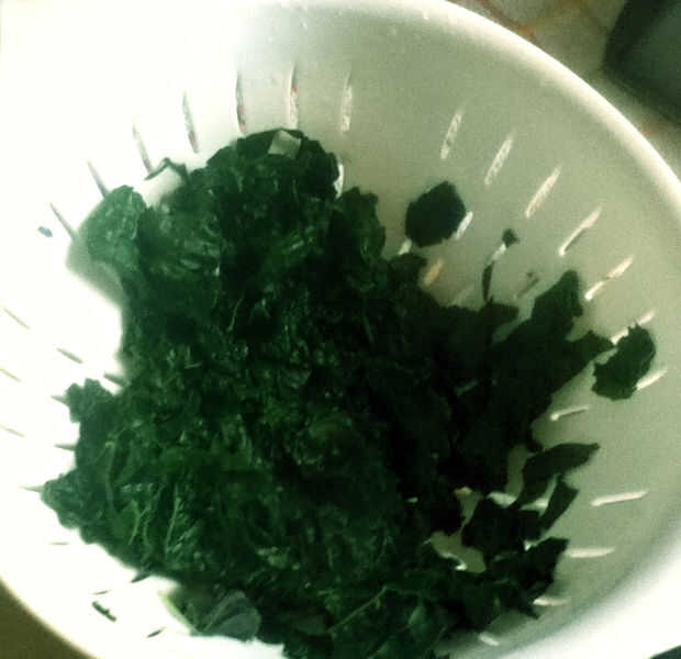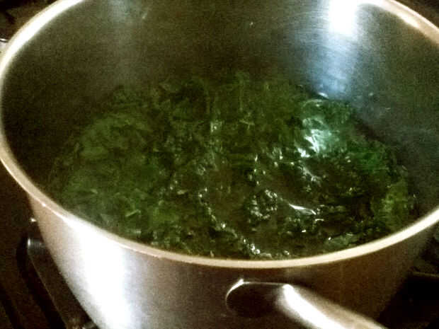 Usted notará que la col rizada es más gruesa y más áspera que la albahaca. Necesita blanquearse para que sea lo suficientemente suave como para puré. Quitar las hojas, picar aproximadamente y echar en una olla de agua hirviendo durante unos 2-3 minutos de cerebros.