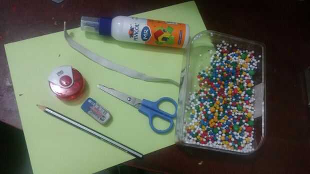 Para esto estoy usando la tarjeta papel, espuma de poliestireno, pegamento, sccisor, lápiz, eresar, cuerda más aguda, elástico