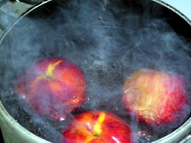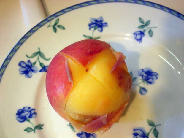 Para pelar fácilmente los melocotones hacen una hendidura cruzada maneras a lo largo de la parte inferior de los melocotones. Luego hervir los duraznos durante 30-60 segundos. Colocar los melocotones inmediatamente en un baño de agua helada. La piel debe deslizarse de la derecha. Mejor había suerte con el melocotón blanco que he utilizado que los regulares. Te sugiero usar melocotón de sillares.