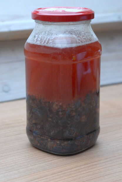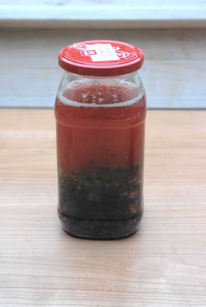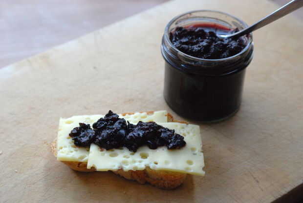 Añadí tres cucharadas de azúcar, una cucharadita de sal y una pizca de canela molida y clavo de olor. Cocina durante unos minutos y lleno en un pequeño recipiente. La salsa resultante es un buen condimento al queso. (Creo que con unas cucharadas de arándanos frescos añadidos sería incluso más afrutado y agradable - pero incluso esta receta de pura prevención de residuos es muy sabrosa)