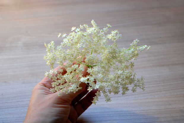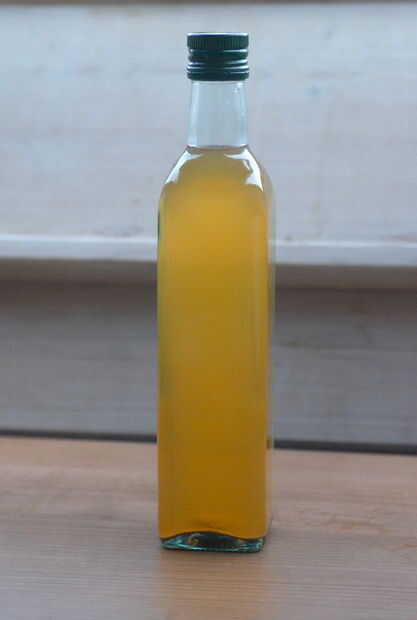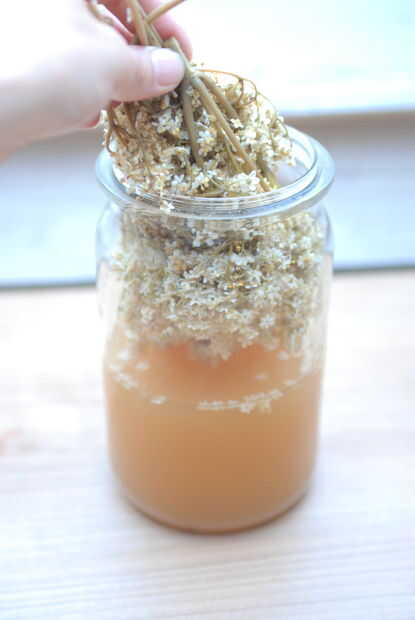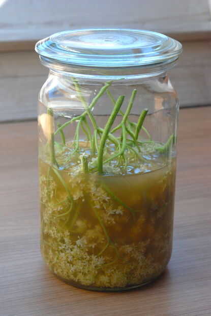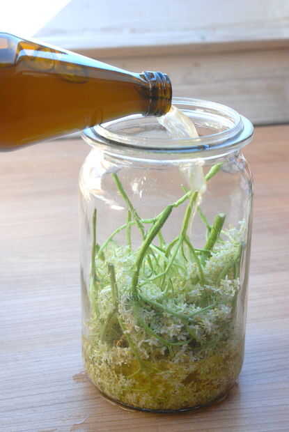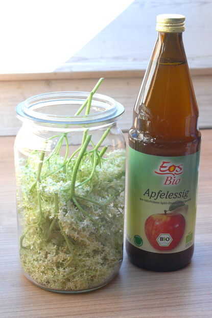 He cosechado sobre 10saúco umbelas, sacudió a deshacerse de cualquier insectos (no lavar las umbelas, usted sería lavar el polen que traen todo el sabor) y ponerlos en un tarro de masón. Cubrí las flores con 0,75 litros / 3 tazas de vinagre de sidra de manzana. He dejó sentarse en mi contador por 4 días y lo agita todos los días.
