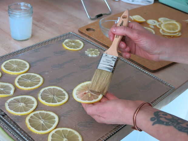 Con un cepillo de adobo, unte la mezcla de almidón de maíz en ambos lados y colocar la fruta en una hoja antiadherente deshidratador.