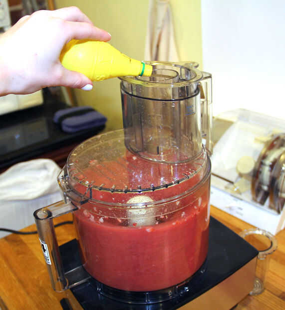 Mezcla la fruta con un procesador de alimentos o una licuadora.  Asegúrese de que obtener su puré de frutas lo más delgadas posible sacando todos los trozos de fruta.  Añadir 1-2 cucharas de mesa de jugo de limón.