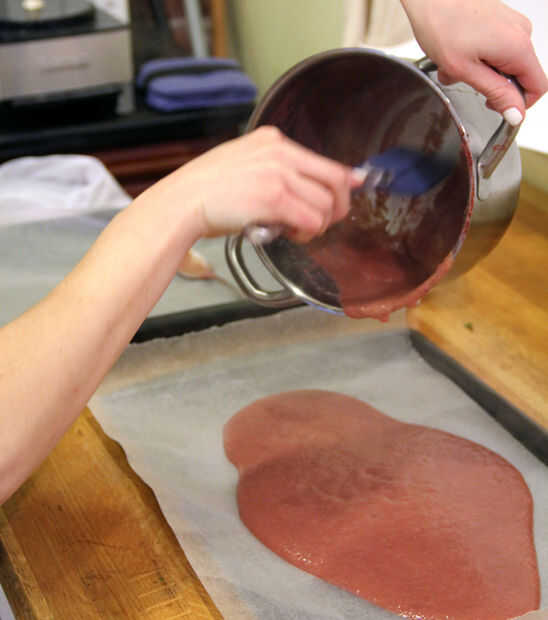 Cocer durante 8 horas.  El cuero de fruta está listo cuando ya no sea pegajosa (puré está completamente seco) y se puede pelar apagado el papel de pergamino.