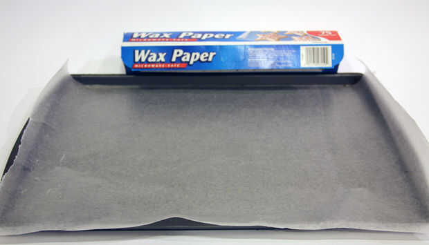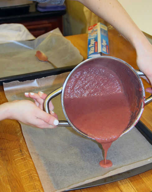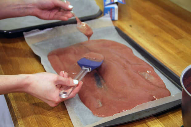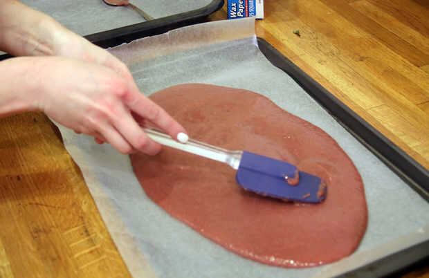 Vierte la mezcla sobre una hoja plana forrada con papel pergamino.  Extienda sobre la hoja con una espátula o la parte posterior de una cuchara.  Asegúrese de que la mezcla se extiende uniformemente sobre la hoja y no demasiado grueso o fino.