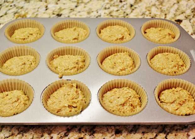 5. Llene su muffin de papel tazas 2/3 completa con masa. Es importante que solo rellenan las tazas 2/3 lleno, porque ayuda a los muffins para cocinar a través de todo el camino. Porque la masa está muy húmeda, si fueras Ileno les sería muy difícil conseguir que se asen a través de todo el camino. Terminas con tapas del mollete quemada y panecillo empapado interiores.