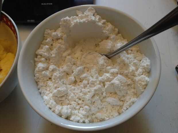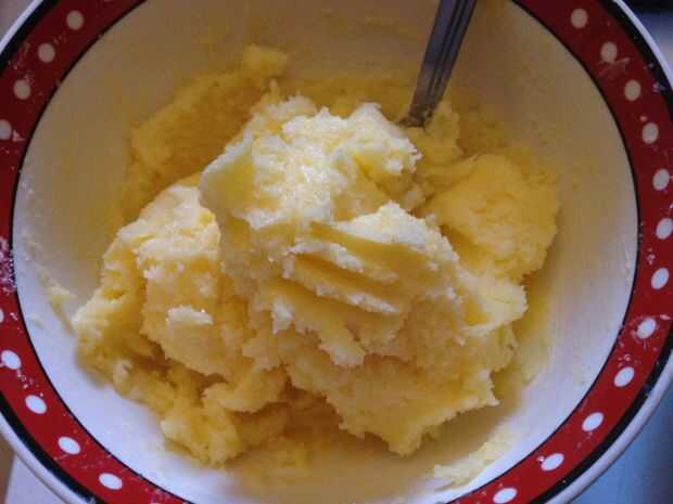 Ahora tome su mantequilla (suavidad media) no es difícil. Cortar en trozos pequeños y se combinan con azúcar en un bol. Mantener en mezcla, a medida que avance la mezcla azúcar y mantequilla. Después de un tiempo se ablanda la mantequilla en la mezcla y entonces somos capaces de hacer una crema (creo que de puré de patatas)... cuando hemos llegado a esta fase que se combinan las harinas y mantequilla crema.