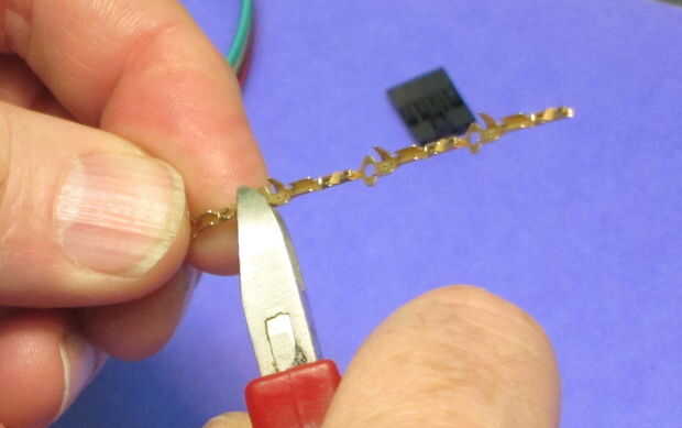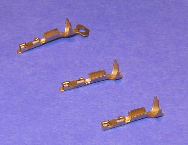Los receptáculos vienen en una tira larga. Cortar 4 de ellos y quitar los ojos de alimentación (los que son para la alimentación de maquinaria generar automáticamente estos tipos de cables). Asegúrese de que el extremo que se inserta en la caja es "cuadrado". Cuando cortarlos aparte es fácil dejar una ficha pequeña de metal extra en un lado del extremo. (véase el extremo izquierdo de cada receptáculo en foto 3) Esta ficha puede impedir que insertar correctamente en el alojamiento.
