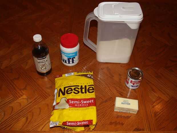 1. ingredientes para tus dulces de chocolate favorito. Hay muchas maneras de hacer fudge y hay muchas recetas en línea, no voy a cubrir aquí. Usé la receta que vino en la jarra de pelusa. Tuve la suerte aquí. Lo único que tuve que comprar fue la leche condensada. Pero si tienes que comprar todo, puede debe ser menores $10.