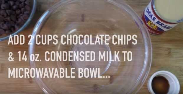 dulce muy fácil! Super chocolate!Ingredientes 3 tazas semidulce chocolate, 4 cucharadas mantequilla, 1 14 oz lata dulce condensada leche, 1 cucharadita vainilla, pizca de salPaso 1: Calentar para arriba! combinar chocolate, leche condensada y la mant