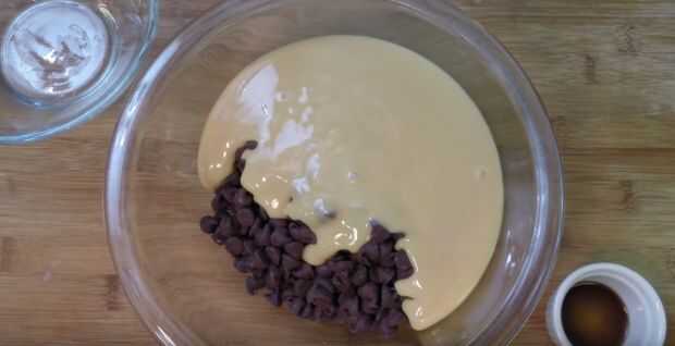 Poner trocitos de chocolate y leche condensada en un bol y combinar.