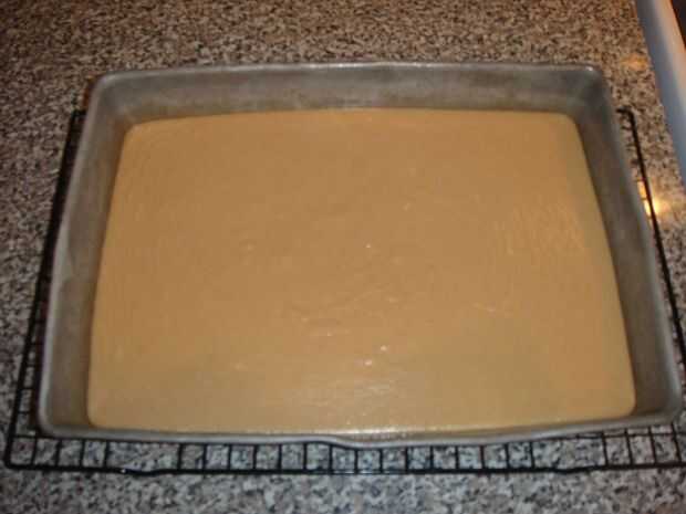 Con la gran cuchara (que usted limpió los cristales de azúcar de antes), vaciar el chocolate en el molde enmantecado 9 pulgadas por 13 pulgadas.