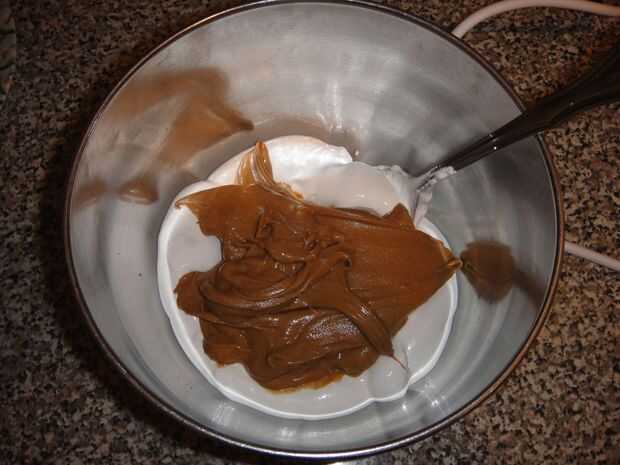 Coloque la crema de malvavisco en una taza.  Coloque la mantequilla de maní en la parte superior la crema de malvavisco.