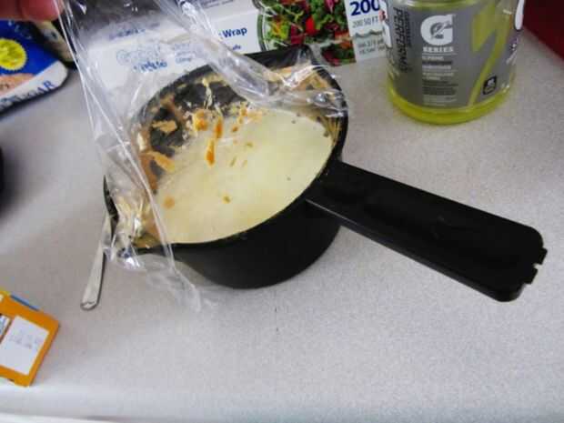 Paso 7: Retirar el recipiente del microondas, parcialmente Retire el envoltorio plástico y revolver la mezcla.