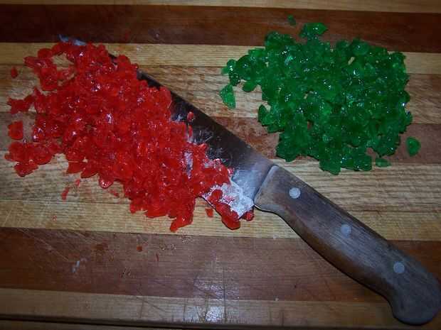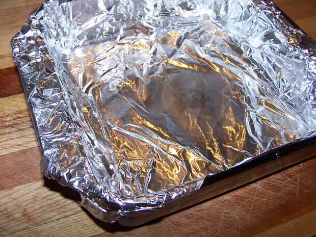 Picar cerezas en trozos pequeños. Este es un trabajo muy pegajoso! Línea una cacerola cuadrada 8" o 9" con papel de aluminio. Alise el papel tanto como sea posible. Dejar hoja extra en los laterales se utiliza más adelante como asideros para quitar fudge.
