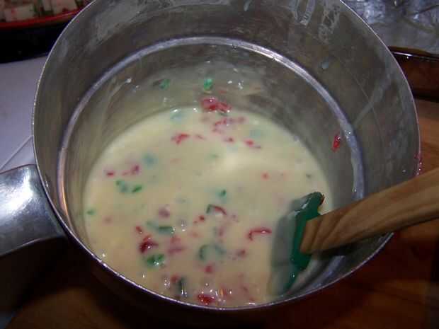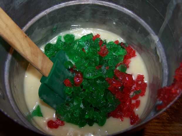 Retirar del fuego, añadir cerezas hasta que bastante uniformemente distribuida. Extender en el molde. La masa sí mismo será suavizar. Si lo desea, pop las burbujas más grandes con un palillo. Sugerencia: Después de haber vertido el fudge en la bandeja forrada de papel de aluminio, coloque la jarra vacía en el fregadero. Utilizar el agua caliente de la olla inferior y Válgase a remojo para facilitar la limpieza.