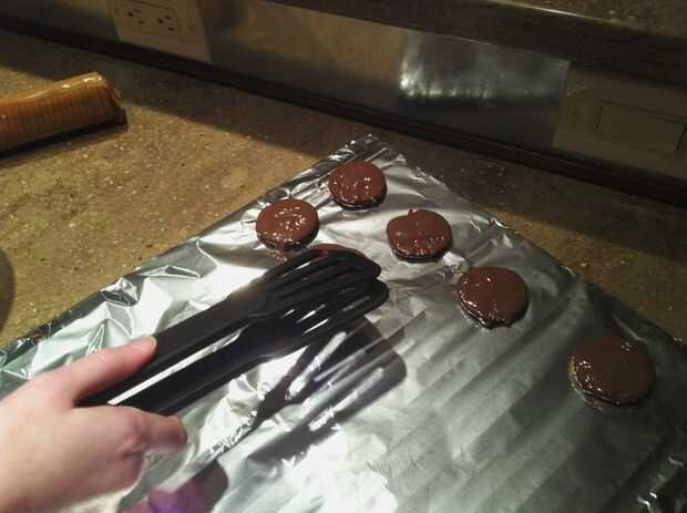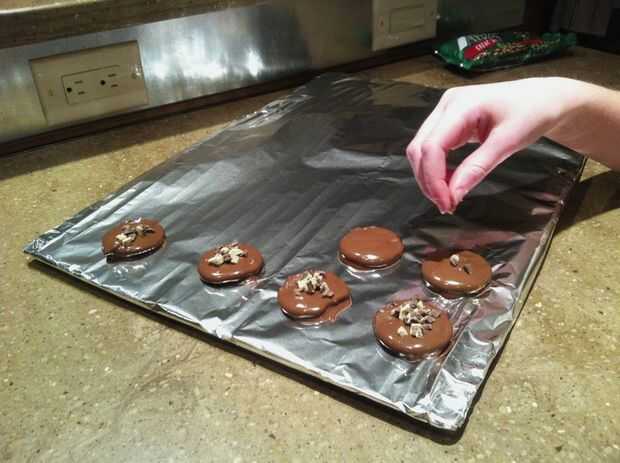 Plop las galletas casi terminadas en su tendedero. Está bien si consigues chocolate por todas partes, que es el papel. Ahora para la decoración y menta-ifying! 1) Vierta algunas de la Ande en un tazón pequeño. 2) deje secar las galletas sobre un minuto o 2 (si pones de la Ande demasiado pronto o demasiado pronto se derrita o que no se peguen). 3) espolvorear sobre sus chips de menta y listo, tienes menta hermosa fudge galletas.
