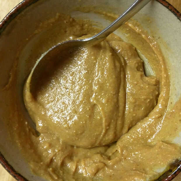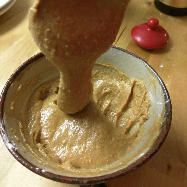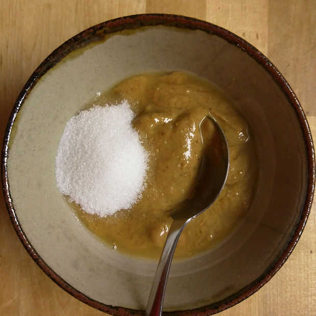 Vamos a mezclar algunos mantequilla de maní! Saque algunas en un recipiente. Si utilizó PB natural, vas a necesita añadir azúcar (utilicé pero granulada, uso pasteleros si lo tiene). Se mezclan. La PB debe ser espeso y pegajoso por lo que mantiene unida la cookie. Usted puede agregar algunos almidón de maíz para ayudar con esto.