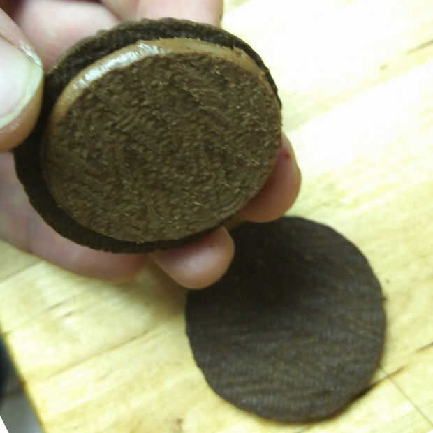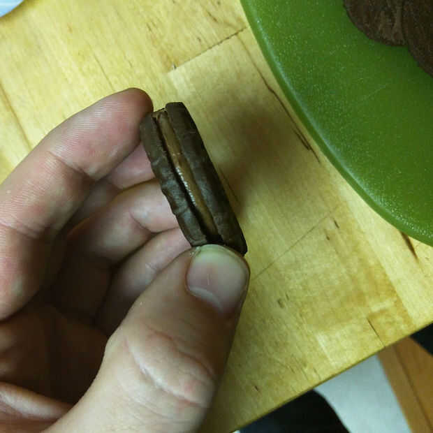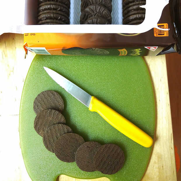 Conseguir su galleta chocolate desgarrando. Fudgee-Os fueron mi cookie de elección, pero si tienes galletas Oreo colocación alrededor, puede utilizarlos. Usted probablemente querrá hacer sobre una docena de cookies.