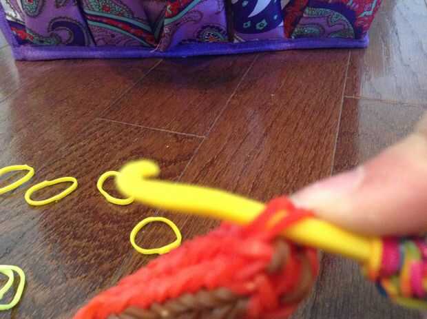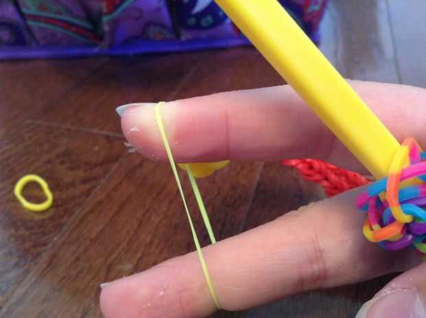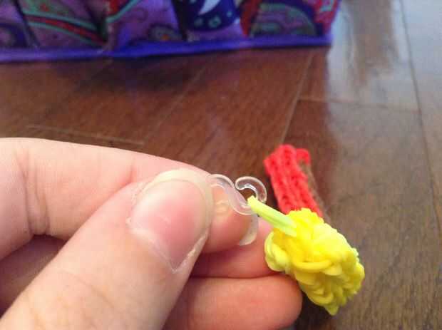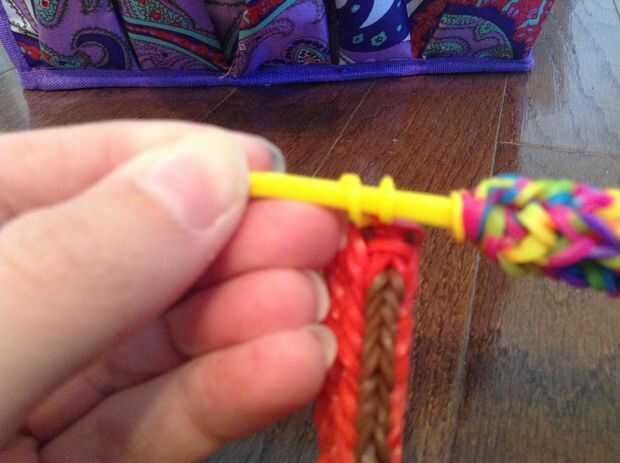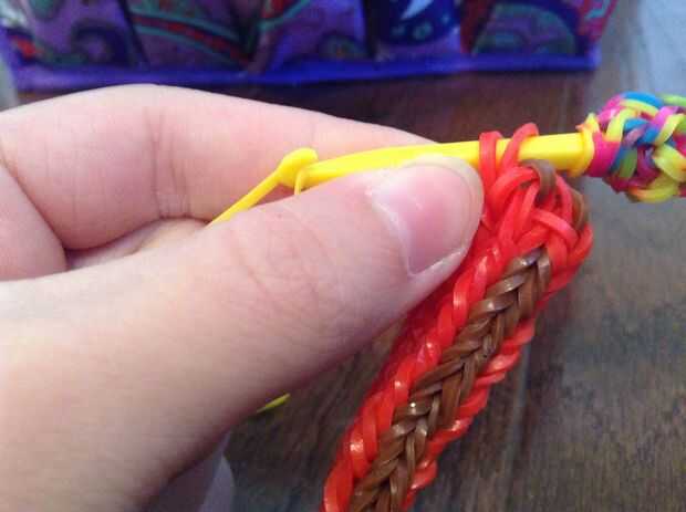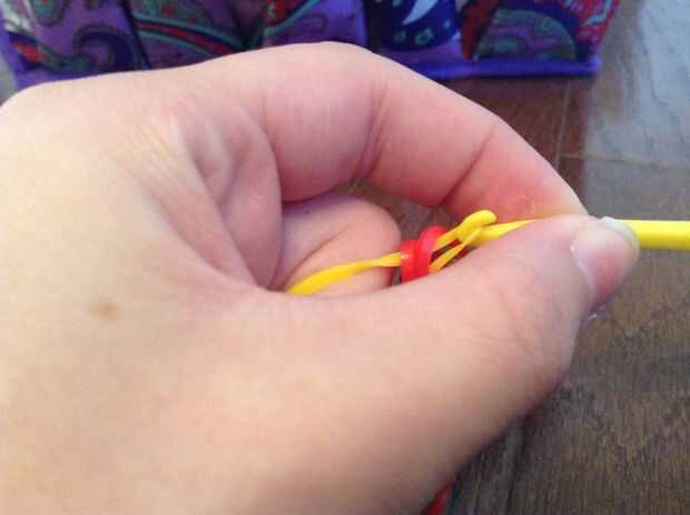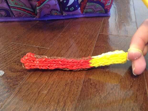 Tomar una banda, puso en el dedo (o gancho) y quitar la pulsera de telar. Ahora, poner en dos dedos, estirar la banda y agregar el clip. Habrá dos suelta una bandas, tomarlos y ponerlos en su gancho. Luego tomar la otra banda (cualquier color) y deslice las bandas A. Repetir alrededor de 2 a 8 veces, dependiendo del tamaño de longitud y de la muñeca de pulseras.