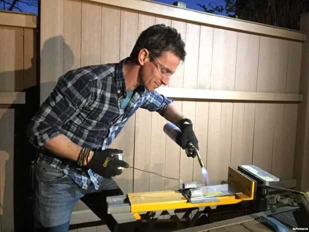 Coloque los acoplamientos y calentarlo. Pensé que necesitaba MAAP, sino propano estaba bien. Tuve la suerte mejor soldar las piezas juntas cuando se aplica después de que el metal cambia de color un poco. También intentó (con éxito moderado) poner las soldadura larga maneras contra la oreja para llamar el flujo en el grano entero, no solo la punta. A diferencia de una tubería de plomería, esto es un largo plano conjunto. Soldar ambos lados y la parte superior de ambos acopladores. Con la soldadura todavía líquida, utilizar un trapo doblado para — con cuidado, limpie el exceso. Hacer esto para ambos terminales.