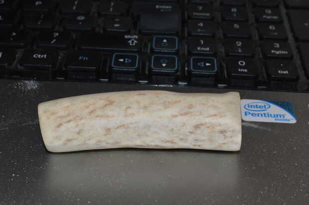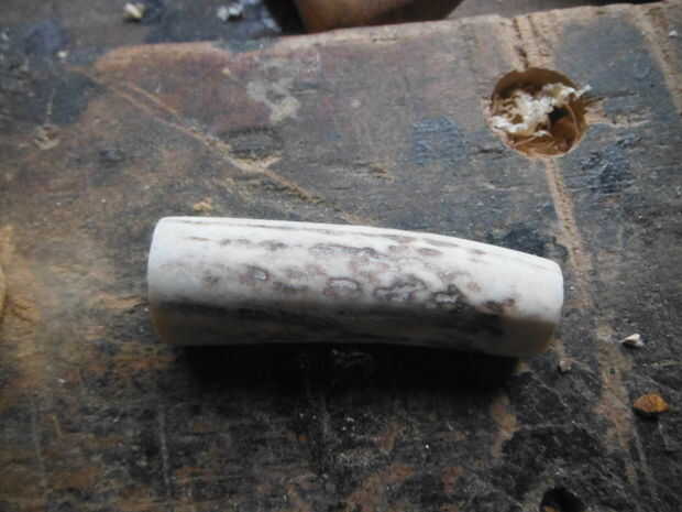 quería un agradable efecto suave de la manija de mi fuego de acero, aunque fácilmente podría dejarlo en su estado natural bruto. Utilicé la pieza lijar en la dremel para quitar la capa exterior áspera y la arena en un pulgar en forma de dip para que el cuerno pulido no se deslice de mi mano cuando golpee. Esto se hizo con un bruto lijado a P60.