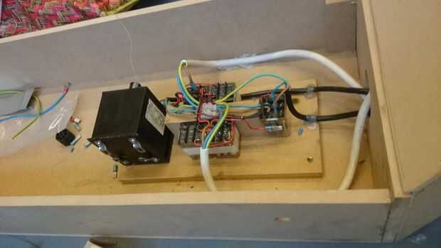 Tome un pedazo de madera. Asegúrese de que es lo suficientemente grande como para el transformador y los 7 Relais. Utilizan el esquema para todas las conexiones de la soldadura. Las conexiones externas se describen en otro paso.