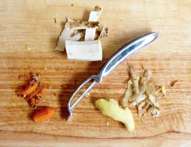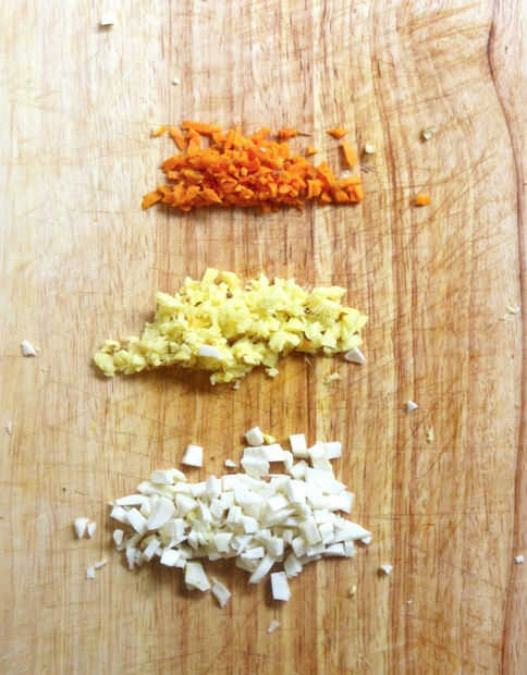 Tiempo para que las raíces. Pelar la piel de la cúrcuma, rábano picante y jengibre. Picar las raíces hasta que haya cantidades iguales de los tres. Coloque sus raíces recién picados en su tarro de cristal encima de la cebolla y el ajo.