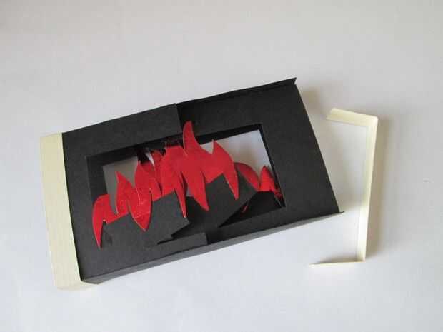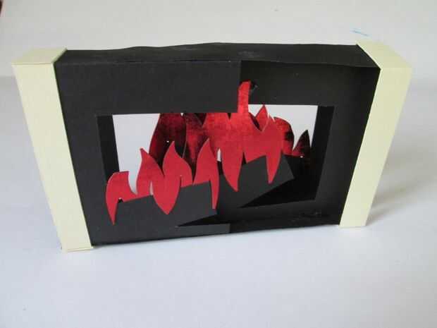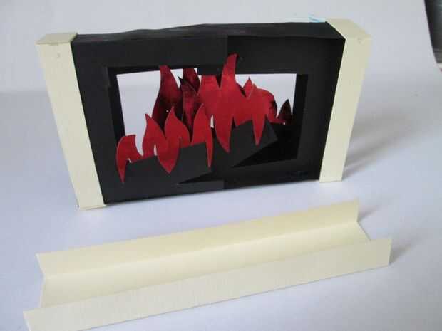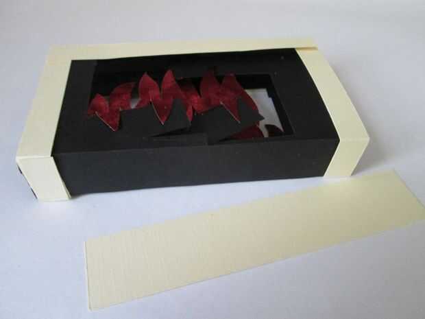 Tiras de pegamento blanco o crema en el lado izquierdo y derecho de la chimenea. Las tiras son de 13 mm de ancho y 13 cm de largo. rhe de lo mismo en el otro lado. Ambos lados de la tarjeta deben buscar el mismo. En la parte superior una franja más amplia se pega con ambos lados plegados (5,5 x 14,8 cm). En la tercera foto la tira puede verse frente a la chimenea. Cubrir el fondo, así como con una estrecha franja (2,5 x 14,8 cm)