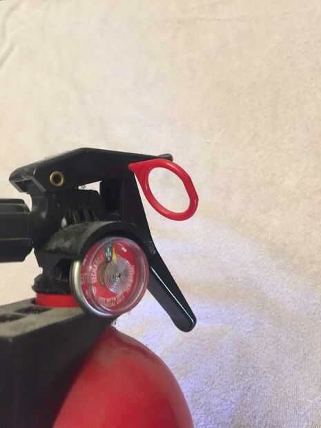 Voy a empezar con el pin, pueden variar de 1 a 3 pulgadas de largo y puede ser metal o plástico con un agujero del dedo en un extremo. Esta pieza se utiliza para evitar que el extintor que se apaga accidentalmente. El pin es en el lado izquierdo del extintor cuando la manguera y la boquilla apuntando lejos de usted.