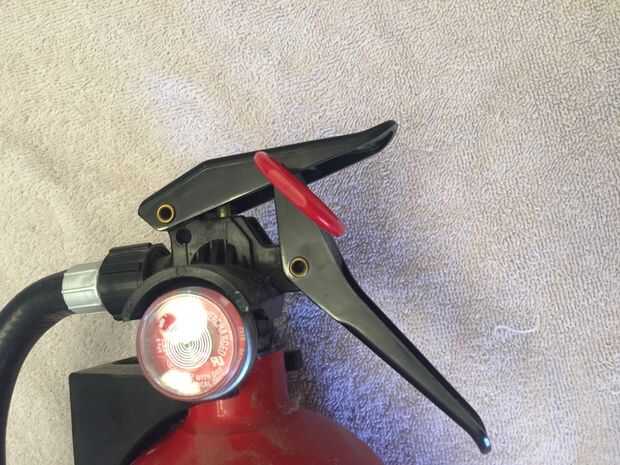 La tercera pieza es el conjunto de la válvula. Esto es lo que activa el agente extintor para ser descargado desde el cilindro. Está situado en la parte superior del cilindro y tiene dos manijas que están en la forma de una V hacia los lados, estas pueden ser de plástico o de metal. La parte inferior de la palanca se moverá hacia arriba cuando tire el pasador, pero sólo se mueve a una posición sólida por lo que se puede llevar a. La parte superior de la V es móvil y esta es la pieza que actúa como un disparador para la descarga del agente. Después de tirar de la clavija y aplican una fuerza hacia abajo que las dos piezas juntas entonces descargará al agente extintor.