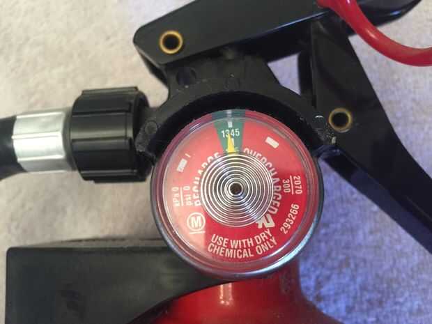 Montaje de la válvula tiene un medidor de presión de cilindro para mostrarle la presión dentro del extintor. Es aproximadamente de 1 pulgada de diámetro con una aguja para indicar la presión. Hay dos diversos colores que se muestra en el medidor, dos zonas rojas y una zona verde. La zona verde se encuentra en la sección superior, media del indicador; la aguja debe estar ubicada en esta zona. La aguja en la zona verde indica al usuario que el extintor está bajo la presión correcta. Si se observa que la aguja está en la zona roja el extintor debe eliminarse porque no tiene la presión adecuada para el material de descarga correctamente, potencialmente poniendo al usuario en peligro.