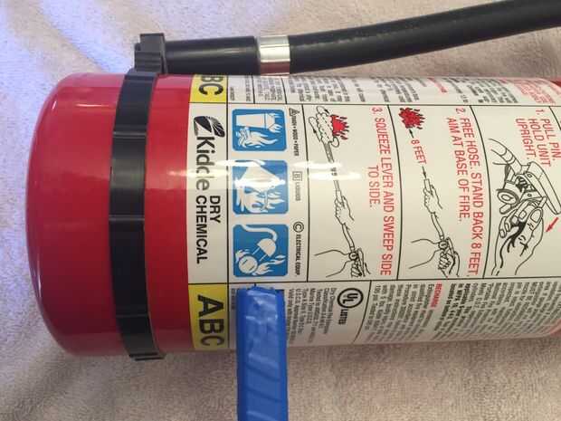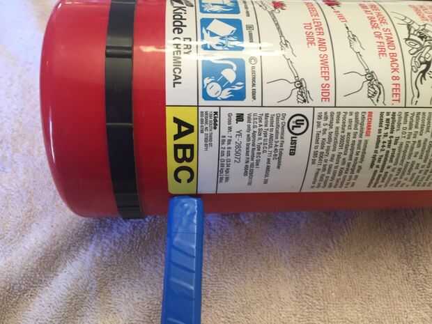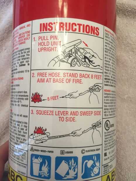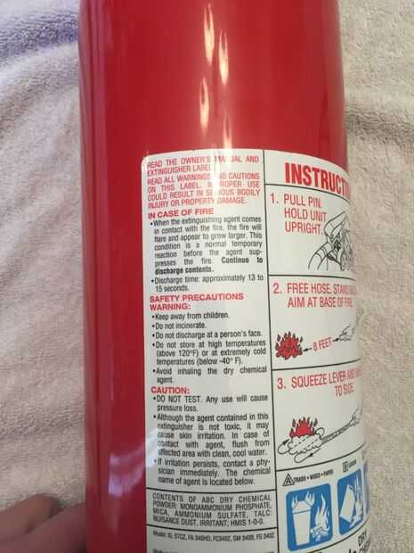 La cuarta pieza es el cilindro sí mismo. Hay un número de diversos tamaños, pesos y productos químicos que usted puede comprar para su hogar. Siempre asegúrese de que tiene el extintor correcto para se extingue con ella, sólo se puede determinar el tipo de extintor que probablemente necesitará. Estos extintores pueden ser de 1 libra a 30 libras. El extintor es una etiqueta de instrucciones que indica qué tipo de fuegos el extintor es recomendado. El tipo de extintor que estoy mostrando, pondrá un fuego de clase A, B o C. Hay 5 clases diferentes de extinguidores de fuego que se pueden comprar. Los fuegos clase A son madera/papel y paño de fuegos de clase B son líquidos inflamables, clase C son eléctricos, son de clase D metales combustibles y clase K son la cocina (como comerciales campanas y freidoras). En la etiqueta del cilindro podrás encontrar las diferentes clases de incendios que puede ser utilizado para poner hacia fuera y el tamaño del fuego que se recomienda. La etiqueta también indicará distancia recomendada de la empresa que debe tener lejos del fuego para la descarga del extintor, junto con los fabricantes recomienda la técnica de uso. También es una fecha de Cuándo fue montado el extintor, las instrucciones de seguridad y etiquetas de advertencia.