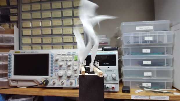 Primero cortar a la tela en la forma de fuego y simplemente mantenerla con la mano para asegurarse de que el ventilador es bastante fuerte. Experimentar con diferentes formas y longitudes de "fuego". Luego pegar a la tela en un palo y encontrar la ubicación ideal. Si colocas a la tela cerca del ventilador, se solapa alrededor demasiado, demasiado y se flop hacia abajo y no "pararse".