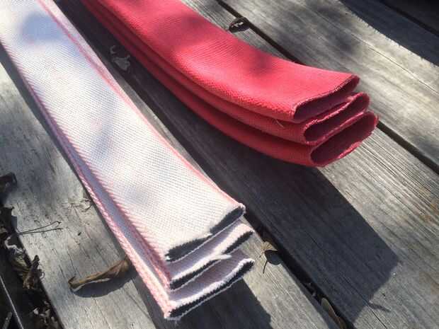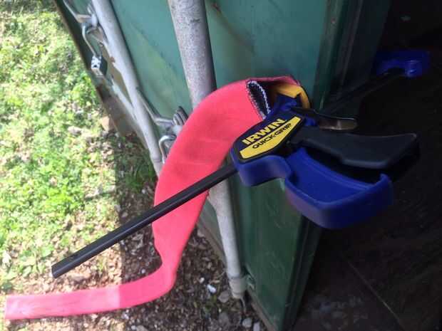 Si usted doble capa manguera de fuego te recomiendo separar las capas. Será mucho más fácil de trabajar con cada capa por separado. La mejor manera que encontré para hacer esto es a una capa. (Recomiendo un tornillo de banco. No tengo un tornillo de banco, así que utilicé una pinza y una puerta de metal.) Estire de la suelta desde el otro extremo. Sujeta la capa externa (rojo) y me tiró en la capa interior (blanca).
