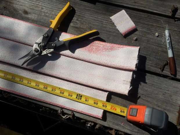 He añadido 2" a mis medidas cuando cortar la manguera de fuego la primera vez. Me gustaria tener un par de pulgadas extras por si acaso cometo un error o la capa de lona empieza a desentrañar. Corte cualquier sobrante de las piezas de la manguera de fuego ahora.