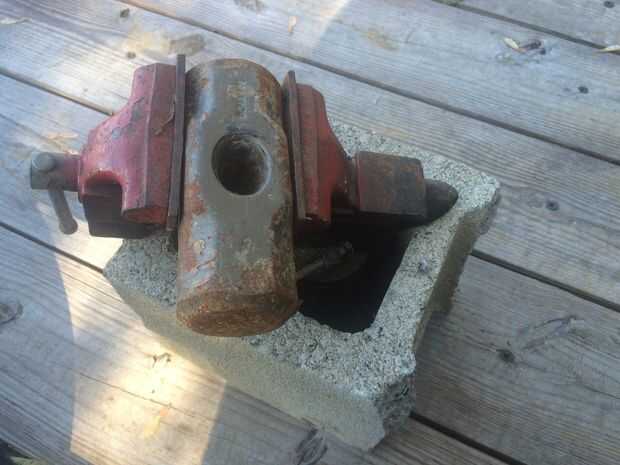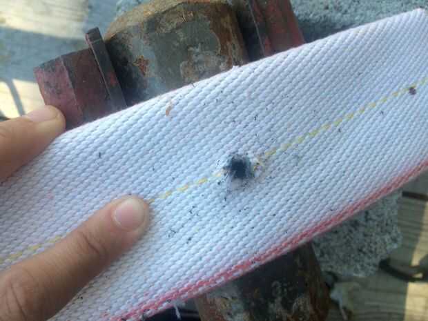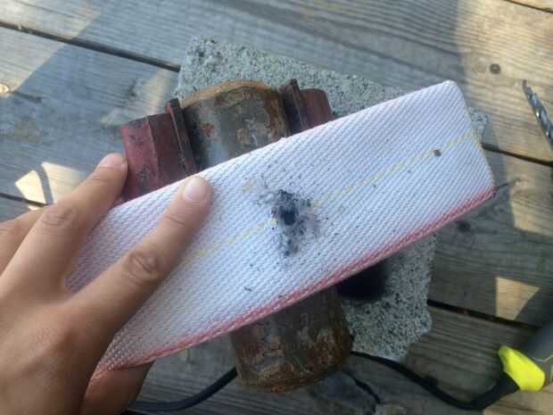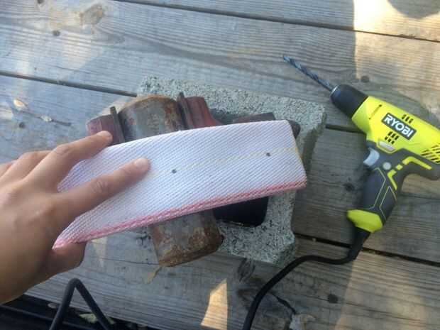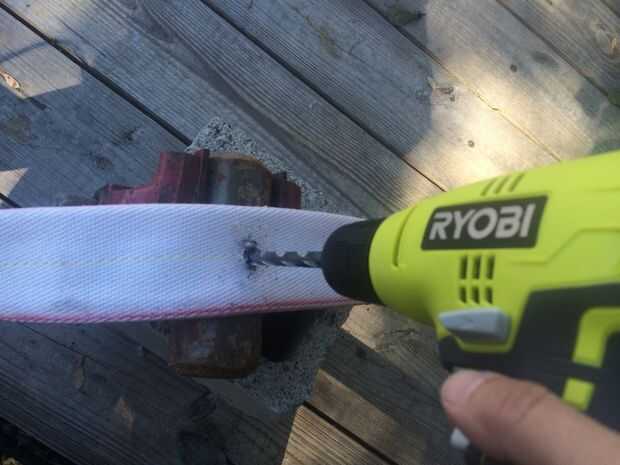 Usar el taladro para la capa de goma de la manguera de fuego. No tengo un tornillo montado, pero yo recomendaría uno. La clave para perforar a través de la manguera de fuego y no simplemente aplicar sangría y doblarla debe tener los bordes de la manguera de fuego de apoyo. Usaba una cabeza de mazo, pero que durante mucho tiempo como usted está sobre una superficie plana con un agujero para la broca en debería funcionar. Una vez que ha perforado a través de la manguera de fuego, limpiar los pedacitos de tela y goma.