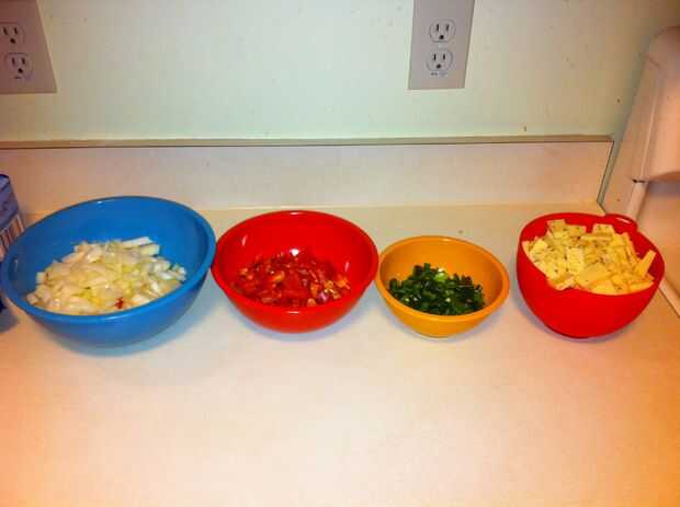 Si su sólido despedazar.  Las verduras, la carne y el queso.  Sobre un dado de 1/4 de pulgada para todos de la misma. Precisión no importa por lo que no hay los dedos en él.