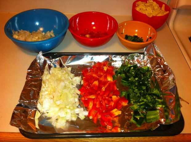 Tomar la mitad de las verduras y ponerlas en una bandeja ligeramente engrasada.  Luego pégalos Suckas en el asador.  Si youre siente aventurero y quiere más sabor lanzar esos chicos malos en la parrilla.  Su un poco demasiado gélida hoy aquí para mí hacerlo.