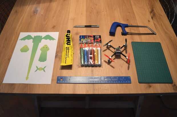 Un drone de juguete de tamaño mediano (aproximadamente 5 pulgadas / 120mm en vano). Aquí he utilizado un Micro Drone (sin cámara) pero el patrón también cabrá un Crazyflie 2.0.