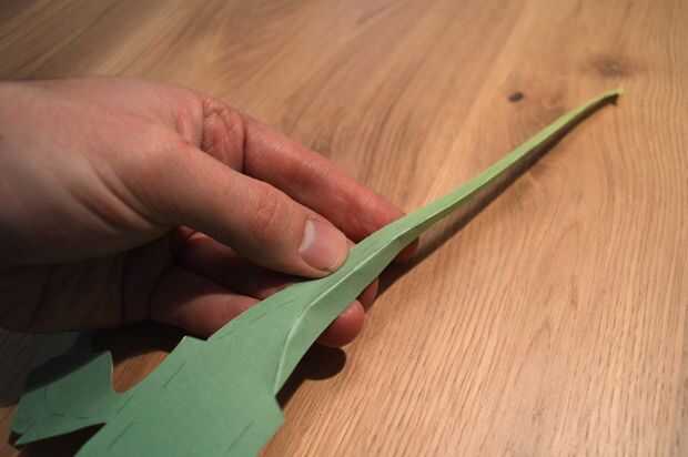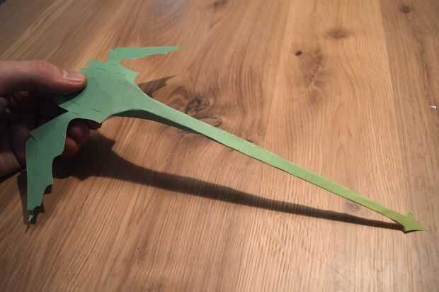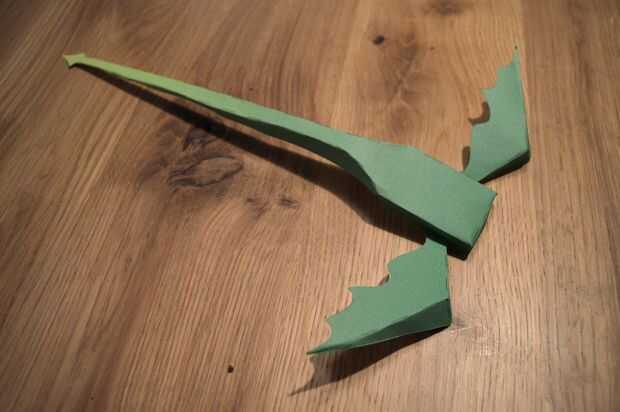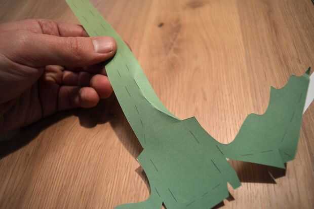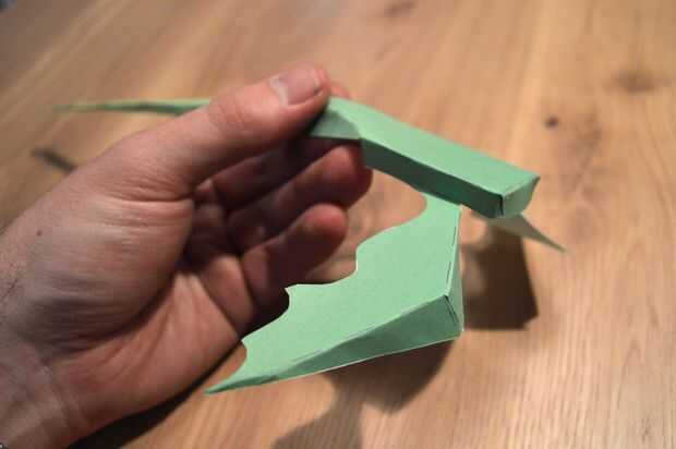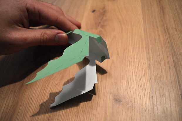 Agarra la pieza de cuerpo. Comience con la sejeción de cola a lo largo de la línea de puntos a cada lado para producir pliegues curvados como se muestra. Hacer los pliegues en el frente y pegar las fichas para hacer una forma de caja. A continuación doblar por la línea punteada en las alas y pegar las pestañas.