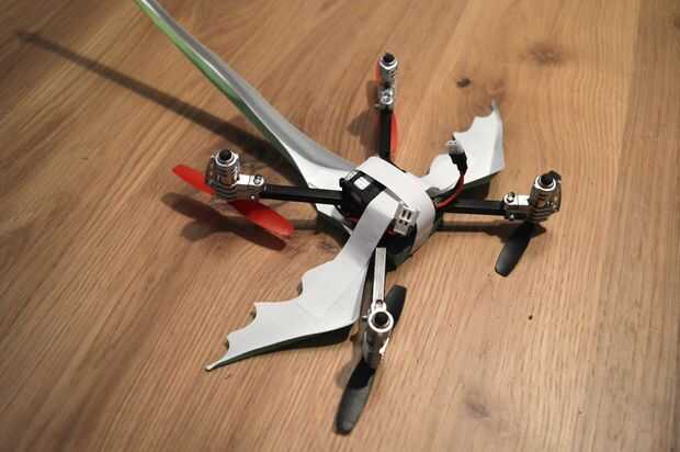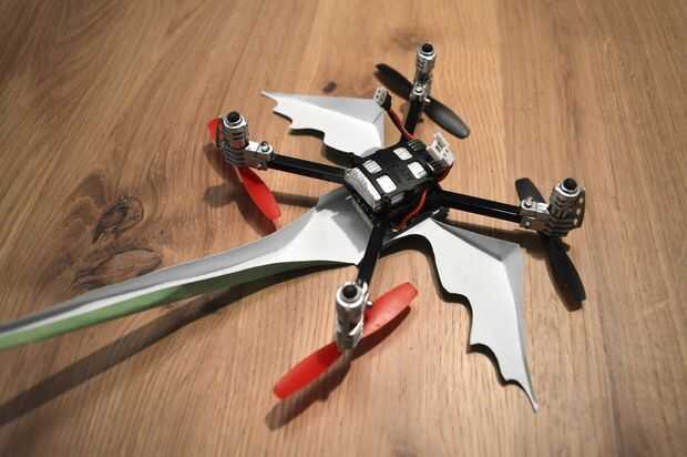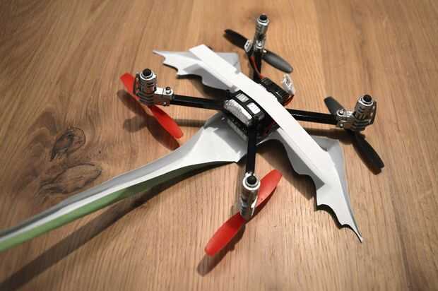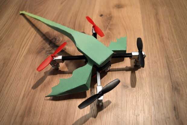 Cubra el cuerpo la parte superior de los aviones no tripulados asegurándose que está hacia la dirección correcta. La parte de la caja en la parte delantera del cuerpo debe sentarse cómodamente sobre circuitos de los aviones no tripulados. Compruebe que todos los propulsores pueden funcionar libremente sin contacto con el cuerpo. Voltee el drone a continuación. Corte una tira de papel de las sobras de la plantilla, pase sobre la parte inferior de los aviones no tripulados y pegar cada extremo de un ala. Esta banda ayuda a mantener el dragón en el drone pero también previene las alas interfiriendo con las hélices cuando el dragón está descendiendo. Añadir una segunda tira de papel desde la parte delantera del cuerpo a la cola como se muestra.