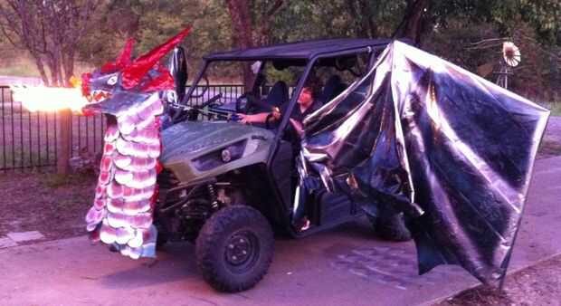 El Dragón consiste en el metal cabeza y cuello, las alas que están hechas de láminas de plástico negro y madera y el artilugio de respiración de fuego que se hace de una antorcha de techo modificado.