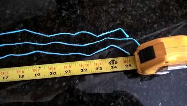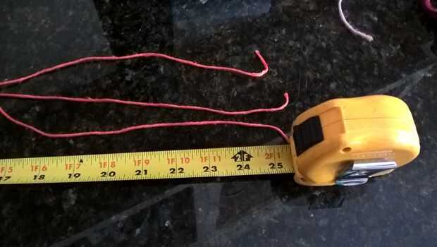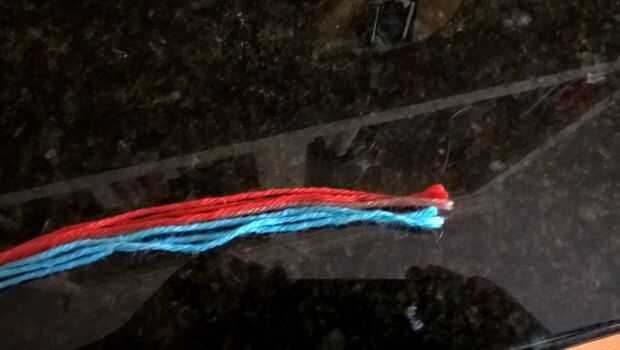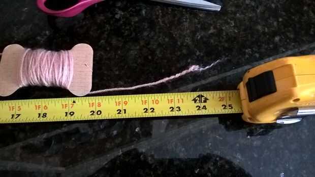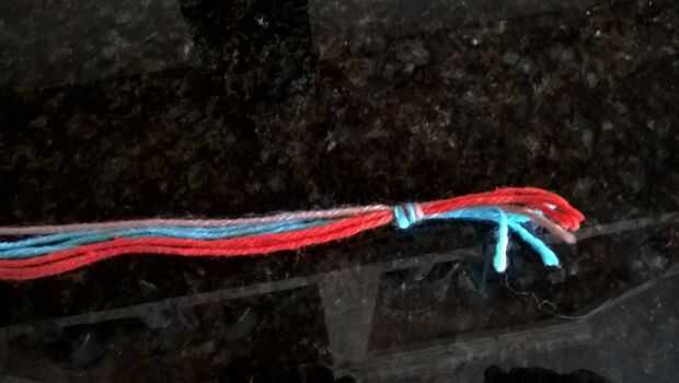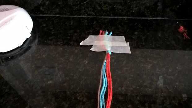 Medir 25 pulgadas de su base (marrón). Medir tres cuerdas de 25 pulgadas de color rojo, lo mismo con azul también. Ahora tomar todas sus cadenas y haga un nudo en la parte superior y cinta hasta una superficie plana.