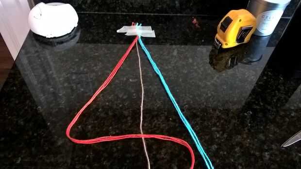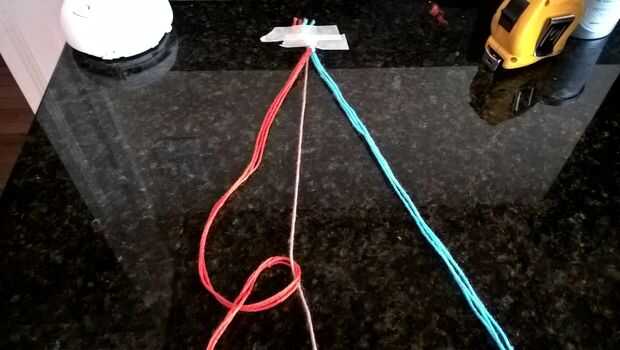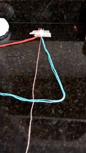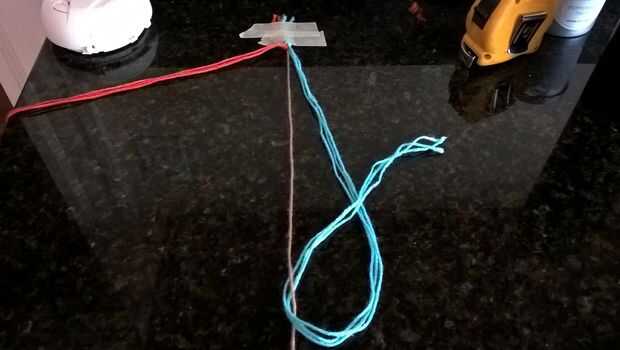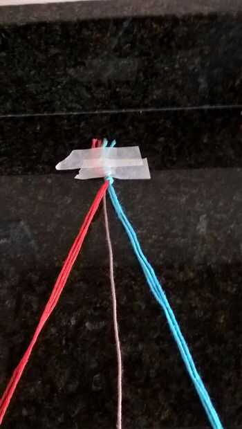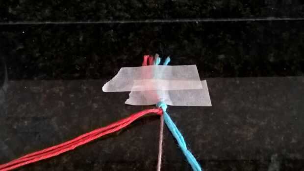 Ahora organizar las cadenas tres rojo son la izquierda, marrón en el centro y azul a la derecha. Ahora toma las 3 cadenas rojo y crear una forma de cuatro, Remétala bajo el marrón y un nudo que esto se conoce también como nudo de la pulsera de amistad hacia adelante. Ahora hacer lo mismo con su azul, pero haciendo un cuatro hacia atrás, esto es el hacia atrás nudo pulsera de la amistad.