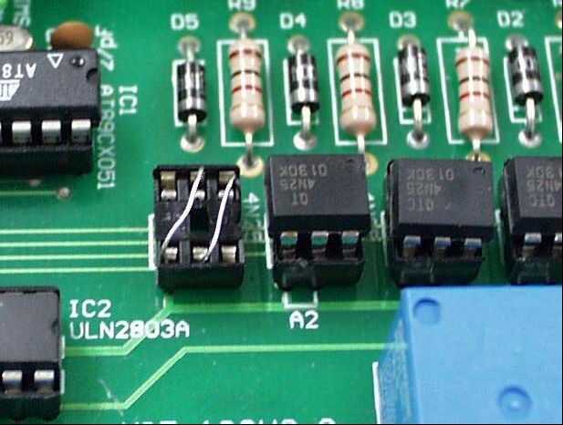 3. quitar IC7, 4N25 de ambos K108s. Inserte dos hilos une o suelda en la parte inferior de la PCB por debajo del zócalo de IC7 o puente-ed como se muestra: