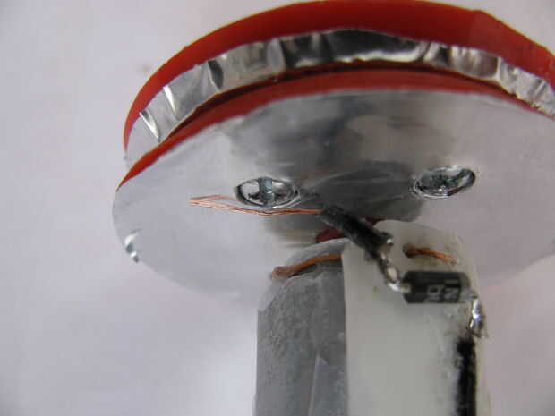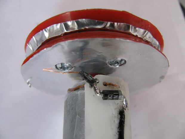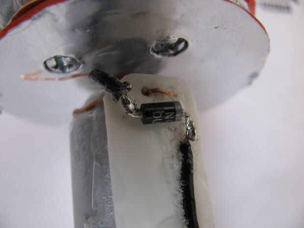 La soldadura de un pin de kathode diodo 1N4007 a la fuente de alimentación negativa y su ánodo a un alambre que está en contacto con el círculo de la hoja exterior de la soldadura.
