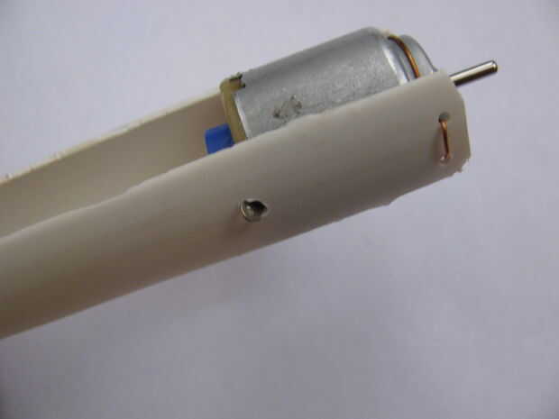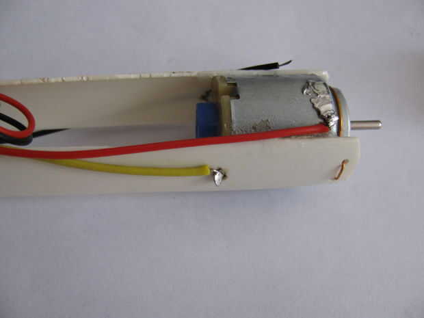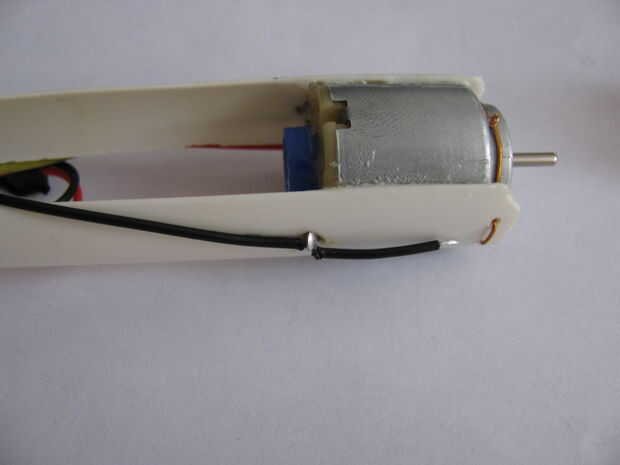 Coloque y fije el motor a las tiras de plástico con pegamento y algunos cables.